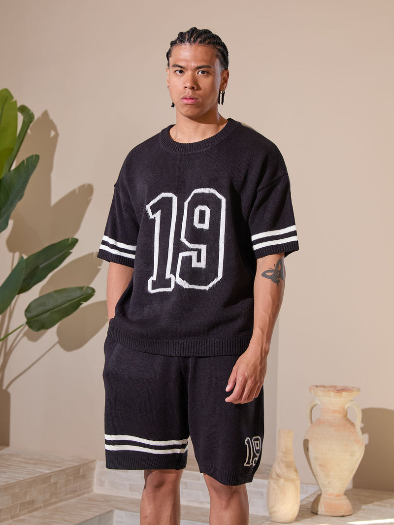 Schulterpartie mit überschnittener Naht, locker sitzendes Strickoberteil. Die Passform ist so gestaltet, dass sie der eines traditionellen Football-Trikots entspricht.