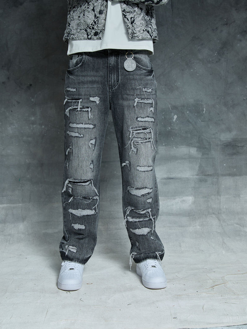 • Jeans de corte holgado, muy rasgados.